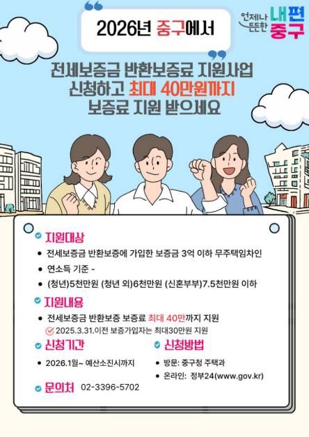 지원 대상은 중구에 거주하는 무주택 임차인 중 전세보증금 3억 이하 세입자로, 소득 요건을 충족해야 한다. 소득 기준은 △청년(만 19~39세)인 경우 연소득 5천만 원 이하 △청년 외 일반 세입자는 6천만 원 이하 △신혼부부(혼인신고일 기준 7년 이내)는 부부 합산 7천5백만 원 이하다.
