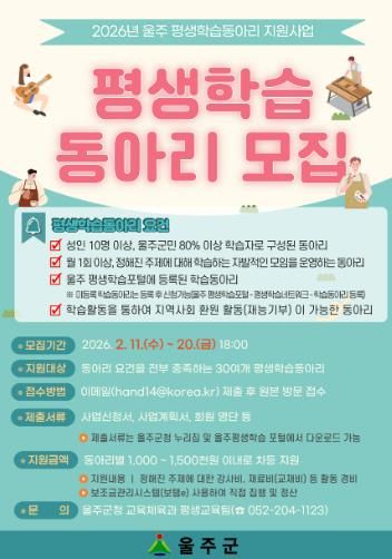 인사이드피플 노재현 기자 | 울산 울주군이 오는 11일부터 20일까지 ‘2026년 우수 평생학습동아리 지원사업’ 참여 동아리를 모집한다고 5일 밝혔다.