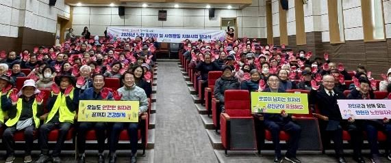 사회자의 구호에 맞춰 “머리안전-모자착용”, “손보호-장갑착용”, “몸안전-조끼착용”을 함께 외치고, 강진원 군수가 노인일자리 대표에게 모자·코팅장갑·형광조끼를 착용시키는 방식으로 진행된 퍼포먼스는 참여자들이 안전수칙을 쉽고 명확하게 체득하도록 했다.