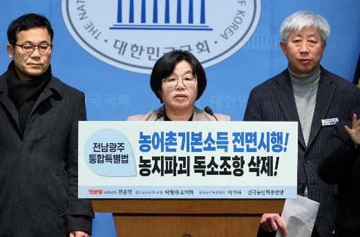 인사이드피플 김재윤 기자 | 전라남도의회 오미화 의원(진보당ㆍ영광2)은 지난 3일, 국회 소통관에서 전남ㆍ광주 통합 특별법과 관련해 농지파괴가 우려되는 조항의 삭제와 농어촌기본소득 전면 시행을 요구하는 기자회견을 열었다.