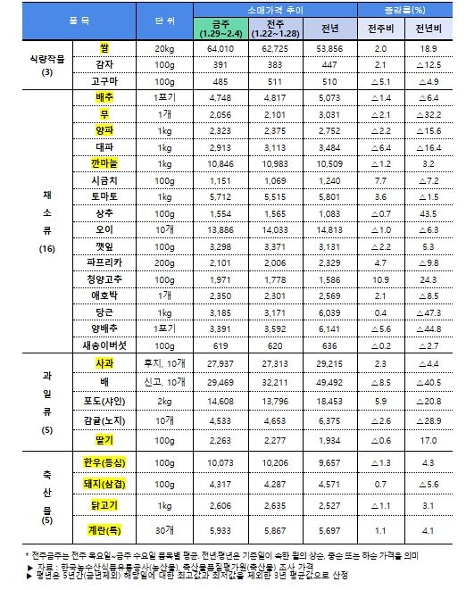 수급 점검 결과 전반적인 설 성수품 가격은 전년 수준으로 비교적 안정적인 흐름을 보이고 있고, 설 차례상 비용도 전년보다 소폭 하락했다. 다만, 대과 위주의 선물용 사과와 지난해 가격이 낮았던 쌀과 한우는 다소 높은 수준을 보이고 있다.