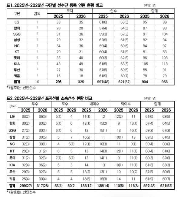 인사이드피플 조은설 기자 | KBO는 2월 10일(화) 2026년 KBO 리그 소속 선수 명단을 공시했다. 10개 구단은 총 621명의 선수를 등록해, 597명이 등록했던 2025년보다 24명이 늘어났다.