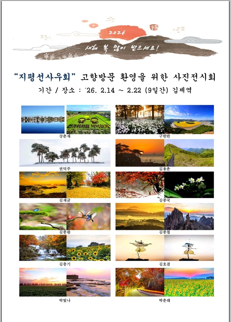 지평선사진사우회 관계자는 “설 명절을 맞아 고향을 찾은 시민들과 사진을 통해 김제의 정취를 나누고 싶었다.”며 “사진이 지역의 기록이자 추억이 되길 바란다.”고 말했다.