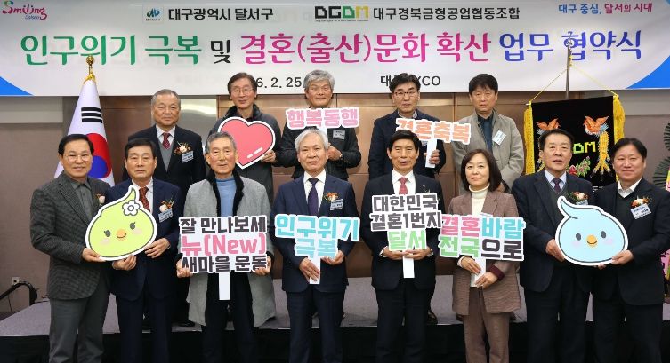 인사이드피플 노재현 기자 | 대구 달서구는 25일 EXCO에서 대구경북금형공업협동조합(이사장 박만희)과 인구위기 극복 및 결혼·출산문화 확산을 위한 업무협약을 체결했다.