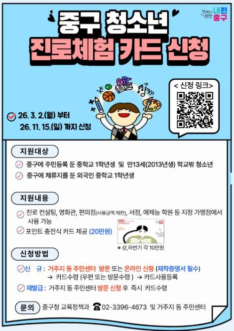 구 관계자는 "중구는 경제적 여건과 관계없이 모든 아이들이 스스로의 꿈을 찾을 수 있도록 지원하고 있다"며 "진로체험카드가 우리 청소년들에게 더 넓은 세상을 경험하고 미래를 설계하는 든든한 디딤돌이 되길 바란다”고 전했다