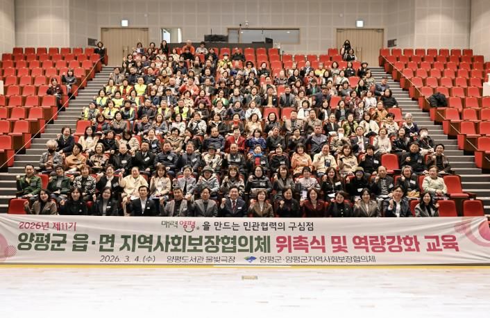인사이드피플 노재현 기자 | 양평군은 지난 4일 양평도서관 물빛극장에서 250여 명이 참석한 가운데 ‘2026년 제11기 읍면 지역사회보장협의체 위촉식 및 역량 강화 교육’을 개최하고, 지역 맞춤형 복지안전망 강화를 위한 본격적인 활동에 들어갔다고 밝혔다.