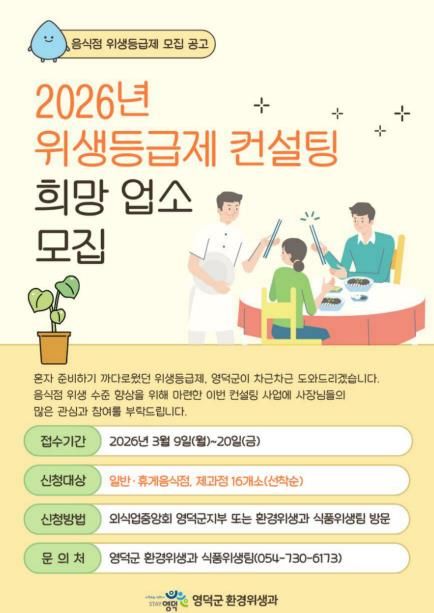 인사이드피플 노재현 기자 | 영덕군은 지역 음식점의 위생 수준을 높이고 외식 환경의 경쟁력을 강화하기 위해 올해 ‘음식점 위생 등급제 컨설팅’ 사업에 참여 업소를 오는 9일부터 20일까지 선착순으로 모집한다.