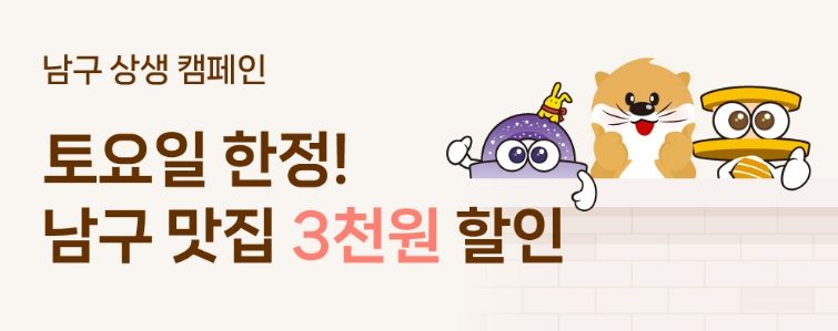 ‘토요일 N 남구데이’는 매주 토요일 대구로 앱을 통해 1만원 이상 주문 시, 3,000원 할인쿠폰을 제공하는 프로그램이다. 발급된 쿠폰은 남구에 위치한 ‘대구로’ 입점 업소에서만 사용 가능하며, 매주 토요일 오전 10시부터 쿠폰이 발급된다.