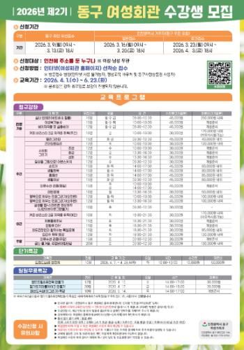 인사이드피플 노재현 기자 | 인천 동구는 오는 3월 9일~4월 3일까지‘2026년 제2기 동구 여성회관’ 수강생을 모집한다고 밝혔다.