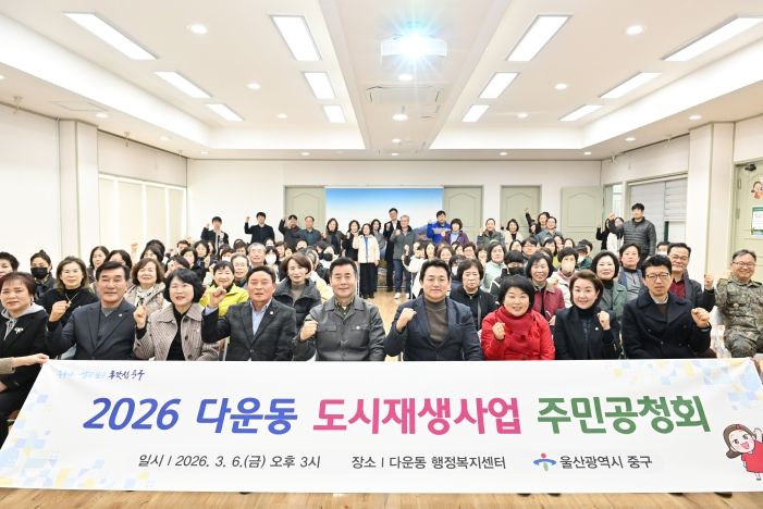 인사이드피플 노재현 기자 | 울산 중구가 3월 6일 오후 3시 다운동 행정복지센터 2층 강당에서 ‘다운동 도시재생 활성화계획’ 변경 수립을 위한 주민공청회를 개최했다.