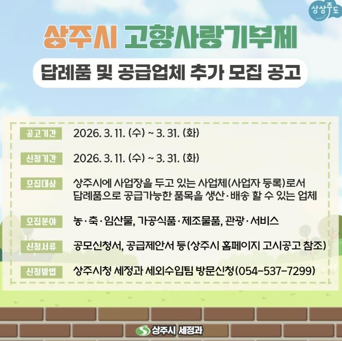 인사이드피플 노재현 기자 | 상주시는 고향사랑기부제 활성화와 지역경제 발전을 위해 고향사랑기부제 답례품 및 공급업체를 추가 모집한다.