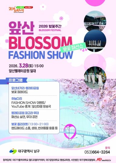이번 행사는 벚꽃 개화시기에 맞춰 오는 28일 앞산빨래터공원 특설 무대와 앞산해넘이전망대, 하늘다리에서 전문 모델과 시민들이 참여하는 패션쇼 이벤트와 다양한 플리마켓이 운영된다.