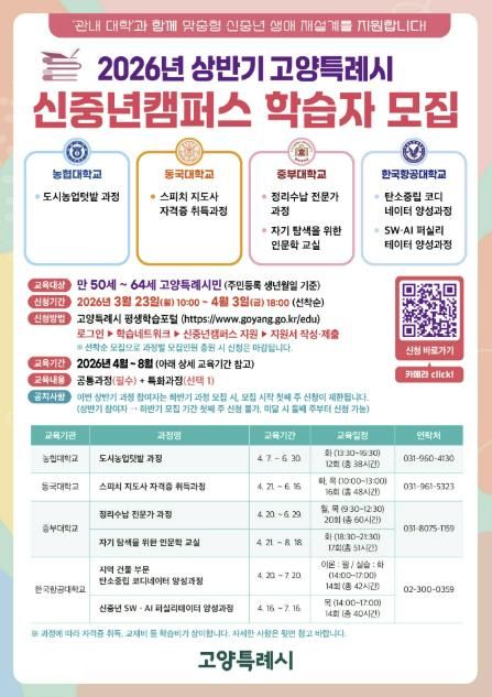 인사이드피플 노재현 기자 | 고양특례시는 ‘2026년 고양시 신중년캠퍼스’ 상반기 교육과정 학습자 180명을 오는 3월 23일부터 모집한다.