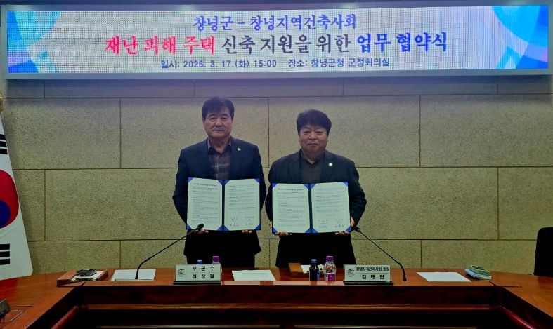 인사이드피플 노재현 기자 | 창녕군과 창녕지역건축사회(회장 김태헌)는 지난 17일 군청 군정회의실에서 ‘재난 피해 주택 신축 지원 업무협약’을 체결했다고 밝혔다.