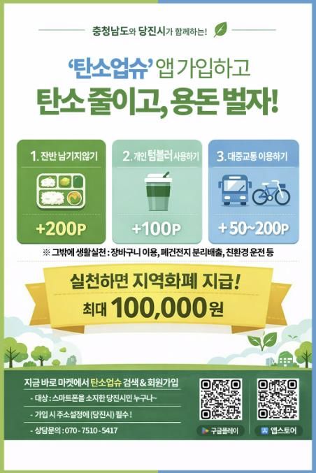 인사이드피플 노재현 기자 | 당진시는 기후위기 대응을 강화하고 시민들의 자발적인 탄소중립 실천을 확산하기 위해 충남형 탄소중립포인트제 ‘탄소업슈’ 가입자 확대를 본격 추진한다고 19일 밝혔다.