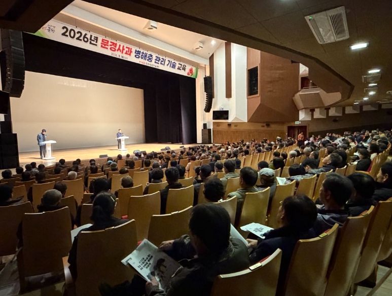 2026년 문경사과 병해충 관리 기술 교육은 ‘2026년 문경사과 병해충 방제력’ 활용 방법과 과수화상병 예방, 효과적인 병해충 방제 전략 등의 내용으로 진행됐다.