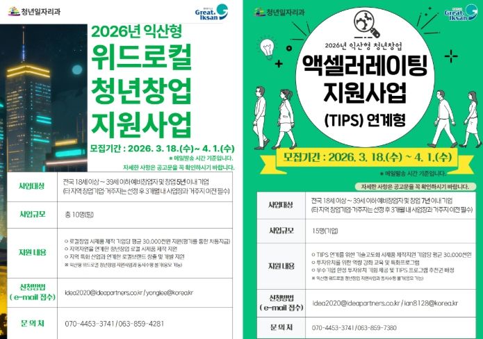 익산시는 '2026년 익산형 위드로컬 청년창업 지원사업'과 '2026년 익산형 청년창업 액셀러레이팅 지원사업(TIPS 연계형)' 참여자를 오는 4월 1일까지 모집한다고 20일 밝혔다.