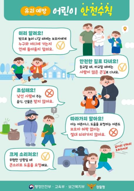 유괴 예방 어린이 안전수칙으로는 ▲외출 시 반드시 보호자에게 목적지 알리기 ▲등하교 시 사람 많은 큰길로 다니기 ▲낯선 사람이 주는 음식이나 선물 받지 않기 ▲보호자 허락 없이는 아는 사람이라도 따라가지 않기 ▲위험 상황에서 큰소리로 도움 요청하기 등이 있다.