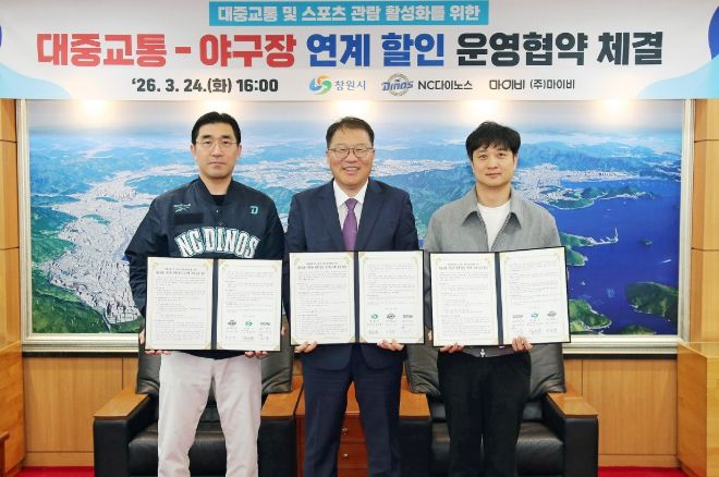 인사이드피플 노재현 기자 | 창원특례시와 NC 다이노스, ㈜마이비는 24일 창원시청에서 시내버스-야구장 연계 할인 서비스 제공을 위한 업무협약을 체결했다.