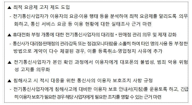 이번 전기통신사업법 개정안은 ①통신사업자가 이용자의 데이터 사용 유형(패턴) 등을 분석하여 최적 요금제를 주기적으로 알림으로써 이용자가 합리적인 요금제 선택을 할 수 있도록 지원하고, ②사기전화(보이스 피싱) 등 범죄 예방을 위해 휴대전화 부정 개통과 관련된 통신사업자의 대리점·판매점 관리 의무 및 제재를 대폭 강화하며, ③침해사고 발생 시 통신사업자의 신속한 대응 체계 구축을 위한 이용자 보호 안내서(매뉴얼) 마련 및 과기정통부의 긴급 조치 명령 근거 마련 등의 내용을 포함한다.