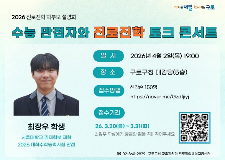 인사이드피플 노재현 기자 | 구로구가 오는 4월 2일 구로구청 대강당에서 ‘2026 수능 만점자와 진로진학 토크콘서트’를 개최한다.