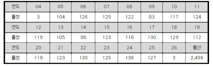 3월 31일 기준 통산 출장 경기 수 10위 이내의 선수 중 강민호가 유일한 포수로 이름을 올리고 있다. 포수 포지션에도 불구하고, 철저한 자기관리로 23년차인 지금까지 단 3시즌을 제외하고 모두 100경기 이상 출장하며 꾸준함을 보여줬다.