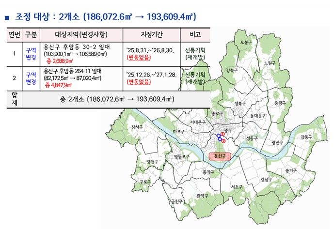 또한, 기존 신속통합기획 주택재개발 2곳은 사업구역 결정 경계에 맞춰 토지거래허가구역 경계를 조정했다. 두 구역 모두 지정 면적이 확대됐으나, 허가 기준 면적(주거지역 6㎡·상업·공업지역 15㎡)과 지정기간은 기존과 동일하게 유지된다. 서울시는 각 구역별 지정기간 만료 시점 전 재지정 필요성을 검토한다.