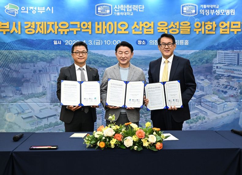 인사이드피플 노재현 기자 | 의정부시는 4월 3일 시청 회룡홀에서 가톨릭대학교 의정부성모병원, 가톨릭대학교 산학협력단과 함께 ‘의정부시 경제자유구역 바이오 산업 육성을 위한 업무협약’을 체결했다.
