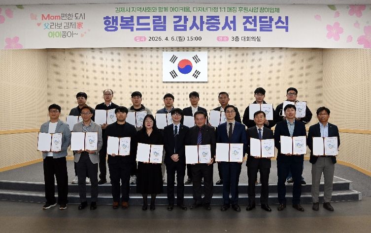 인사이드피플 노재현 기자 | 김제시는 6일 시청 대회의실에서 ‘다자녀가정⇔기업․단체 행복드림 매칭사업’에 참여한 후원업체 대표 및 관계자들을 초청해 감사증서를 전달했다고 밝혔다.
