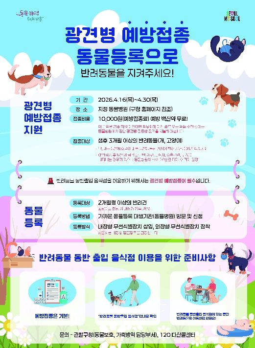 구는 이번 사업을 위해 광견병 예방백신 3,320개를 무상 지원한다. 보호자는 접종비 1만 원만 부담하면 된다. 참여 동물병원은 모두 65곳이며, 병원 목록은 구청 홈페이지에서 확인할 수 있다.