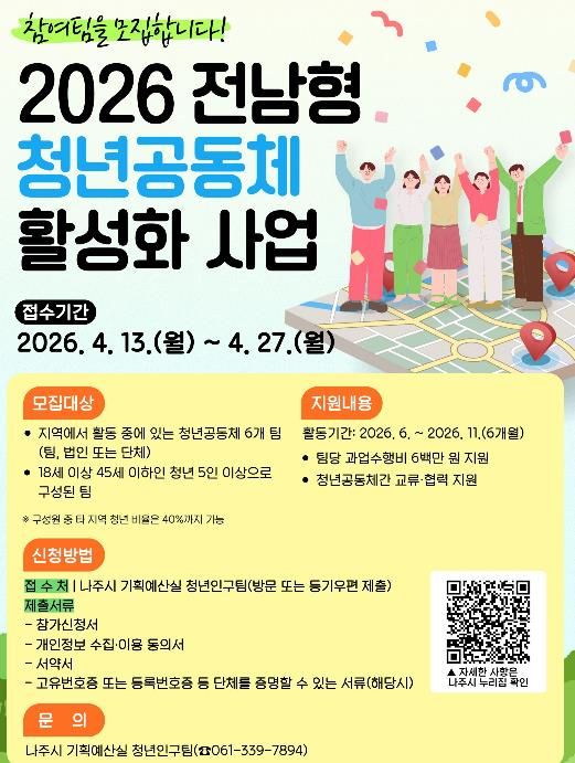인사이드피플 노재현 기자 | 전남 나주시는 10일 청년들의 지역 활동 기반 마련 및 지역 활성화를 도모하기 위해 ‘2026년 청년공동체 활성화 사업’에 참여할 팀을 모집한다고 밝혔다.