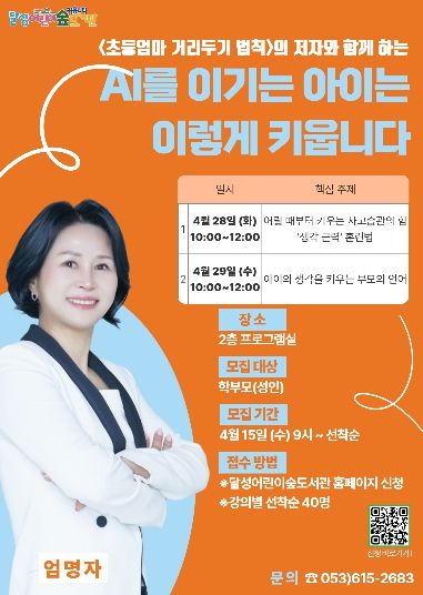 인사이드피플 노재현 기자 | 대구 달성군 달성어린이숲도서관이 지역 학부모를 대상으로 한 부모교육 특강 ‘AI를 이기는 아이는 이렇게 키웁니다’의 수강생을 모집한다.