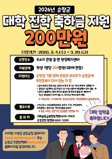 ‘대학 진학 축하금 지원사업’은 순창군에서 장학회에 사업비를 출연해서 추진하는 사업으로 지역 학생들의 대학 진학을 축하하고 학부모의 교육비 부담을 경감하기 위해 마련됐다.