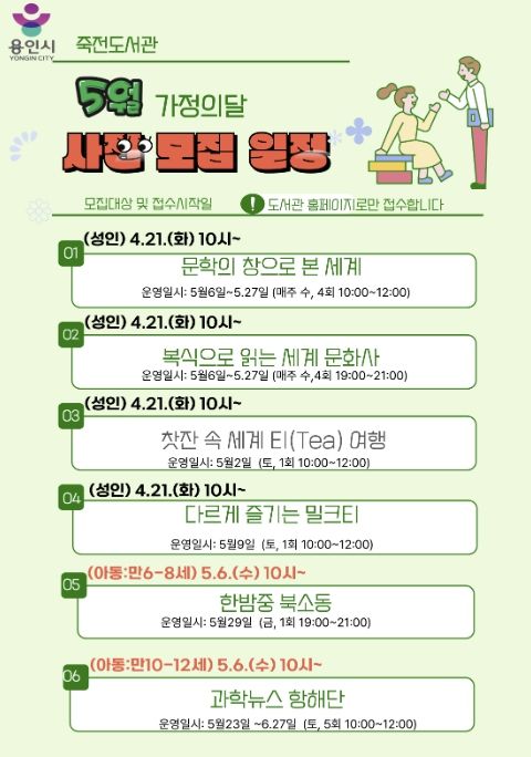 인사이드피플 노재현 기자 | 용인특례시 죽전도서관은 오는 5월 가정의 달을 맞아 ‘2026년 5월 독서문화행사’를 개최한다.