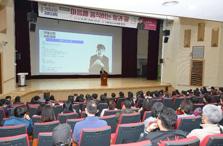 ‘거제시민자치대학’은 소통, 미술, 도전, 심리 등 다양한 주제로 새로운 지식과 즐거움을 제공하는 시민 맞춤형 명사 초청 강연이다.