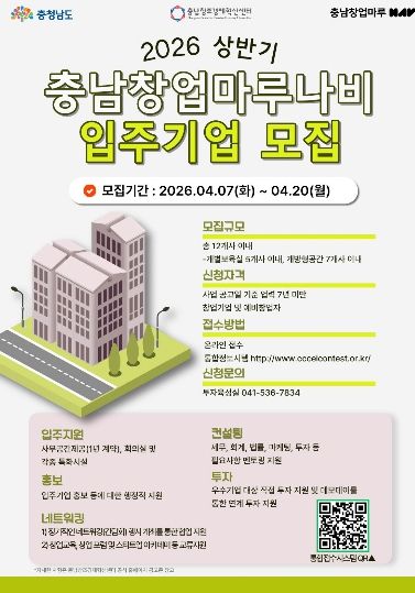인사이드피플 심정보 기자 | (재)충남창조경제혁신센터는 이달 20일까지 2026년 충남창업마루나비 입주기업을 모집한다고 밝혔다.