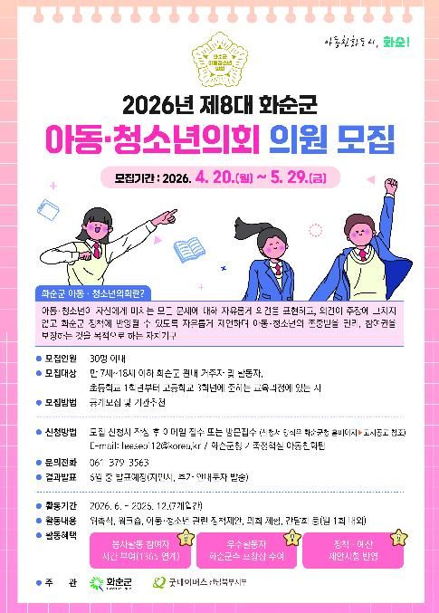 인사이드피플 노재현 기자 | 화순군은 ‘2026년 제8대 화순군 아동·청소년의회’ 의원 30명을 오는 4월 20일부터 5월 29일까지 공개 모집한다고 밝혔다.