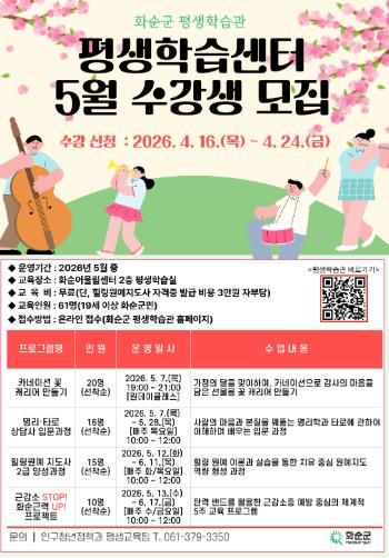 프로그램은 화순 어울림센터 2층 평생학습센터에서 진행되며, 모집 인원은 19세 이상 화순군민 61명이다.