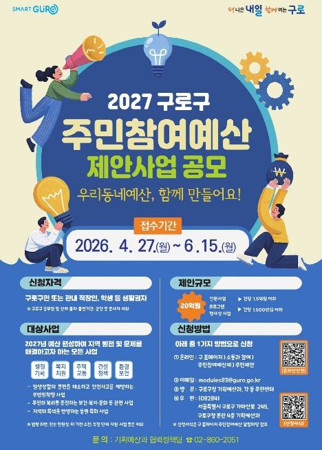 인사이드피플 노재현 기자 | 구로구가 2027년 예산에 편성할 ‘주민참여예산 사업 공모’를 4월 27일부터 6월 15일까지 진행한다.