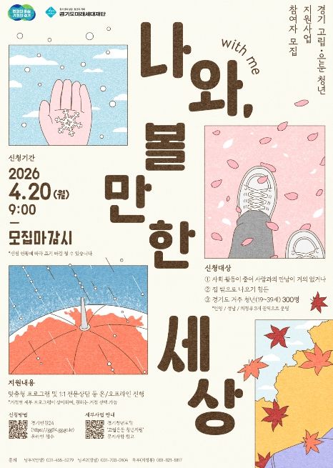 인사이드피플 노재현 기자 | 경기도가 사회적 관계가 단절된 고립·은둔 청년의 일상 회복을 돕기 위해 20일부터 ‘경기 고립·은둔 청년 지원사업: 나와(with me), 볼만한 세상’ 참여자 300명을 모집한다.