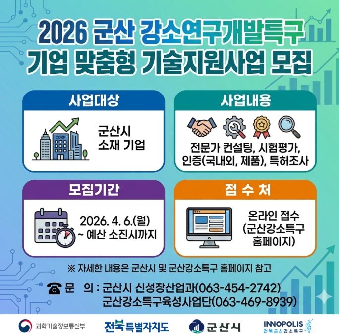 인사이드피플 심정보 기자 | 군산시는 관내 기업의 기술 경쟁력 강화를 위해 ‘2026년 군산 강소연구개발특구 기업 성장단계별 기술지원사업’을 본격 추진한다고 밝혔다.