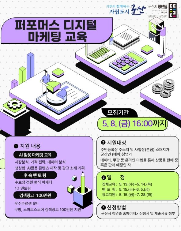 인사이드피플 심정보 기자 | 군산시 청년뜰 창업센터가 4월 20일부터 5월 8일까지 지역 온라인 창업가의 디지털 마케팅 역량 강화를 위한 '2026년 퍼포먼스 디지털 마케팅 교육' 참여자를 모집한다.
