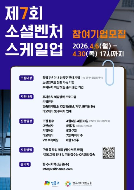인사이드피플 노재현 기자 | 서울 성동구는 관내 소셜벤처기업을 대상으로 투자 유치 역량 강화를 위해 2026년 제7회 소셜벤처 스케일업 프로그램 참여기업을 모집한다고 밝혔다.