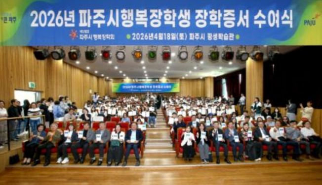 인사이드피플 노재현 기자 | 파주시는 (재)파주시행복장학회가 지난 18일 파주시 평생학습관 대공연장에서 학부모와 장학생 등 200여 명이 참석한 가운데 2026년 장학증서 수여식을 개최했다고 밝혔다.
