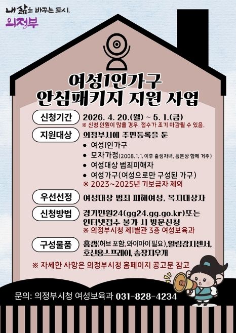 인사이드피플 노재현 기자 | 의정부시는 4월 20일부터 5월 1일까지 12일간 온․오프라인을 통해 여성 1인 가구 안심패키지 지원사업의 신청을 접수한다.