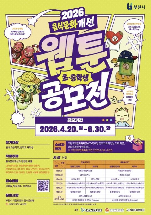 인사이드피플 노재현 기자 | 부천시는 4월 20일부터 6월 30일까지 ‘2026년 음식문화개선 초중학생 웹툰·캐릭터 공모전’을 연다. 이번 공모전은 학생들이 일상 속 음식문화를 주제로 직접 창작에 참여함으로써 올바른 식문화에 대한 인식을 높이기 위해 매년 추진되고 있다.
