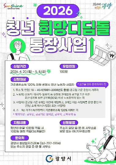인사이드피플 노재현 기자 | 광양시는 전라남도와 함께 청년의 자산 형성과 미래 준비를 지원하기 위해 ‘2026년 청년 희망디딤돌 통장사업’ 참여자를 모집한다고 밝혔다.