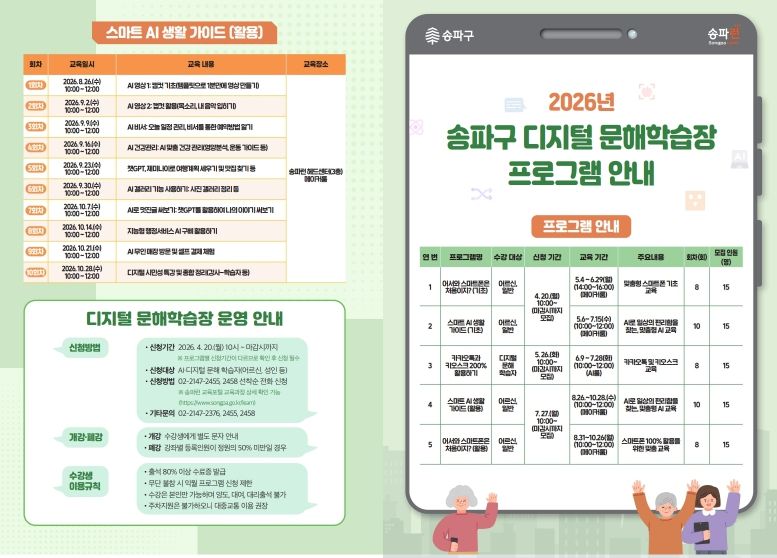 신청 대상은 송파구민 중 디지털 기기 활용이 익숙하지 않거나 AI 학습에 관심 있는 성인이면 누구나 가능하다. 모든 교육은 무료로 운영한다.