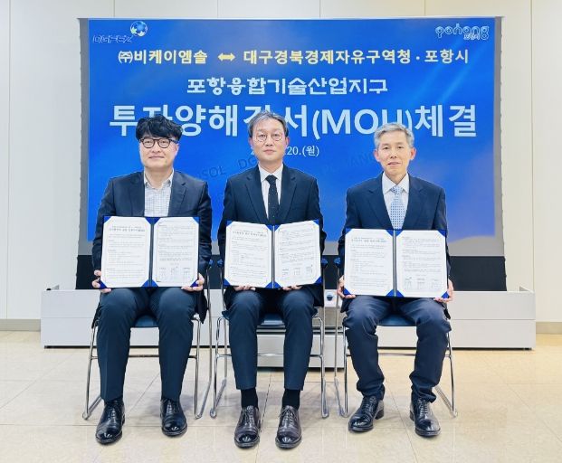 인사이드피플 심정보 기자 | 포항시와 대구경북경제자유구역청은 20일 ㈜비케이엠솔과 포항융합기술산업지구 내 투자 유치를 위한 양해각서(MOU)를 체결했다.