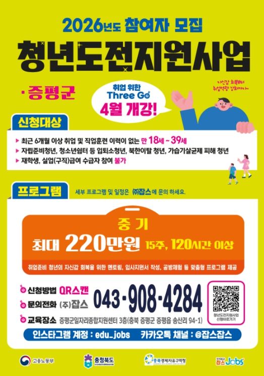 신청은 홍보물에 안내된 QR코드를 통해 가능하며, 세부 일정과 프로그램 관련 문의는 수행기관인 ㈜잡스로 하면 된다.